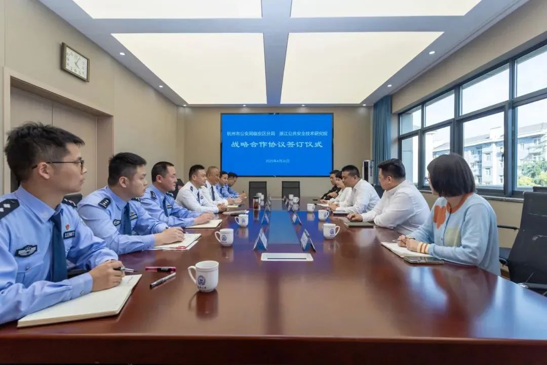 浙江公共安全技术研究院院长陈港、临安区副区长、公安分局局长黄品代表双方签署战略合作协议